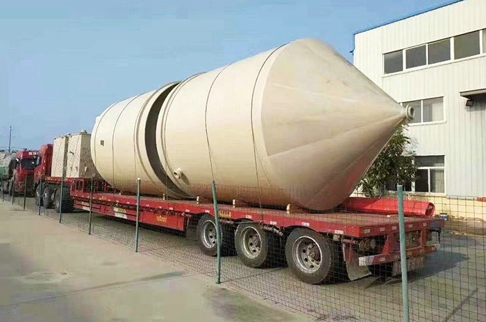 錐底儲罐采用意大利技術(shù)制作,內(nèi)襯層為噴射成型制作,內(nèi)襯層的富樹脂層樹脂含量達95%,內(nèi)襯層樹脂含量為80%。儲罐內(nèi)襯層采用錐形水泥模具制作,儲罐結(jié)構(gòu)層為整體纏繞制作而成。罐體底部為帶鋼套環(huán)支腿,大大提升儲罐穩(wěn)定性。攪拌型錐底立式儲罐,內(nèi)設(shè)擋流板,罐體頂部設(shè)置支撐架,儲罐輕質(zhì)、高強,耐腐蝕性強、使用壽命長。